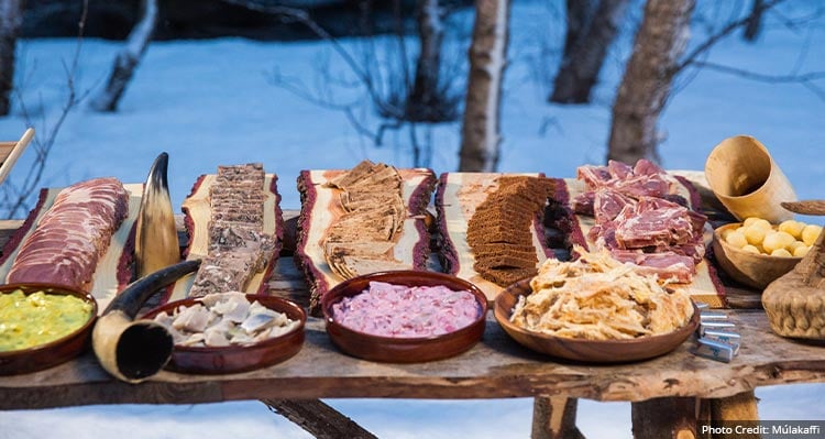 Þorrablót feasts are the central element of Þorrinn. Throughout the month, families will gather to share in traditional delicacies, including hákarl (fermented shark’s meat), svið (boiled sheep’s head) and kjötsupa (lamb meat soup). The preferred drink to toast the god of thunder is Iceland’s signature potato-based schnapps Brennivin, which translates loosely to “black death” in English. Traditional music, dancing, games and storytelling complete the evening, which can often last into the early hours of the following morning.